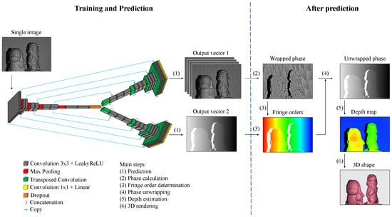The 3D shape reconstruction techniques integrating the FPP-based method with deep learning typically fall into two groups: fringe-to-depth and fringe-to-phase approaches. The former group intends to perform an image-to-image transformation using a neural network model where the input–output pair is a single structured-light image and a corresponding depth map [38,39,40,41,42,43]. Compared with the typical deep learning-based depth estimation techniques from a single image in the computer vision field, the major differences include a structured-light input and a high-quality depth map output [44,45,46]. First, the structured-light illumination applies desired feature patterns for accurate geometric information extraction, particularly in the textureless regions. Second, the ground-truth depth maps produced by the FPP-based 3D imaging technique provide higher accuracy (originated from full-field sub-pixel image matching) than the ones obtained from the RGB-D sensors.