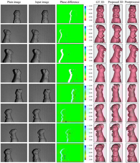 Even though the proposed technique closely resembles the well-known classic FPP technique for accurate 3D shape reconstruction, the results can be partially sketchy because of the dependence on the supervised-learning datasets. As the phase distributions depend on not only the actual object profiles but also the geometric setup of the imaging system, the trained model is valid only for the specific system configuration used in dataset generation. If the relative geometric configuration between the camera and projector changes, recapturing new datasets for training is imperative. For this reason, generating synthetic datasets based on the calibration parameters of the actual system for network training can be a favorable solution [38,45]. Nevertheless, further investigation is necessary to make such a network model reliable for real-world applications.