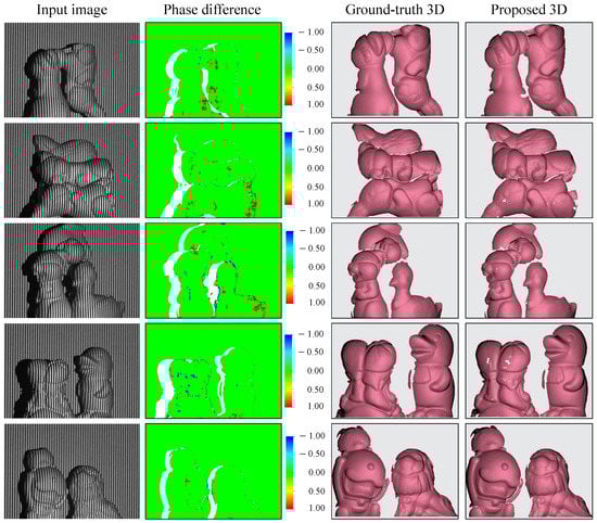 As the second output is the predicted unwrapped phase, one question which can arise is the following: can the predicted unwrapped phase be employed directly for the 3D shape reconstruction following Equation (5)? In the extended investigation shown in Figure 5b,c, the predicted unwrapped phase and the refined phase are compared. It is clear that the errors in the refined phase map occur in small and limited areas, whereas the errors originating from the predicted unwrapped phase spread out to larger regions. The depth maps and the 3D shapes associated with both evaluated unwrapped phases are reconstructed to further demonstrate their performance. It is evident from the results that the predicted phase map results in an inconsistent depth map and noisy 3D shape, while the refined phase map from the proposed method can produce a high-accuracy 3D shape similar to the ground-truth label.