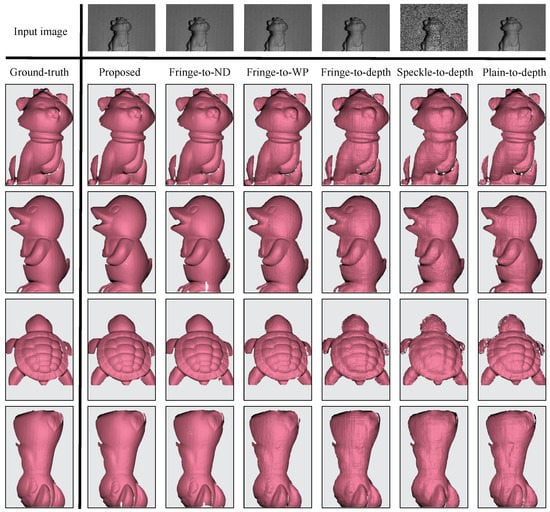 Figure 9 shows the corresponding 3D reconstructions of the proposed, fringe-to-phase, and image-to-depth techniques. It is clear that the three fringe-to-phase techniques outperform the image-to-depth counterparts because the intermediate results help retain more feature information. It can also be seen that several holes and incorrect shape regions appear in the fringe-to-ND and fringe-to-WP results, which is probably due to the misalignment between predicted outputs and the obtained fringe orders. It is also shown that the speckle pattern is not a desired option for the image-to-depth network [36] since surface textures can be concealed by random pattern (unlike regular fringe pattern). Furthermore, the plain-to-depth technique obtains noisy 3D results despite being capable of yielding discernible textures. Table 1 summarizes the numerical errors and accuracy metrics of the proposed and other techniques. The first three rows from Table 1 reveal that the accuracy performances of the proposed and the fringe-to-ND techniques are similar, while the fringe-to-WP approach offers a slightly lower performance.