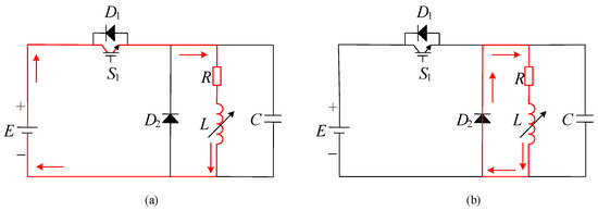 The schematic diagram of the working circuit of the multidirectional electromagnetic shock source is shown in Figure 2. The method of direct battery power supply is used to regulate the power-on time by controlling the on-off of the IGBT. is the energy storage battery, is the control switch IGBT, is the coil resistance, is the coil inductance, is the coil distributed capacitance, and is the freewheeling diode. Figure 2a describes the circuit discharge process. At this time, the IGBT is closed, the circuit is connected, and the battery is directly powered to form a conduction circuit. The coil has current flowing through it to form a magnetic field to accelerate the hammer in the moving cavity. At the same time, the coil acts as an inductor to store a certain amount of energy during the discharge process. As shown in Figure 2b, when turning off the IGBT, the inductor forms an afterflow through the freewheeling diode , and consumes the energy stored during the discharge process through the coil resistance. The single working process of the electromagnetic source consists of the discharge process and afterflow process.