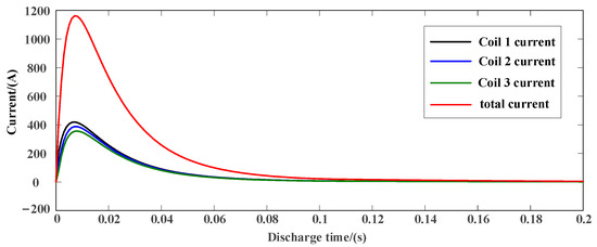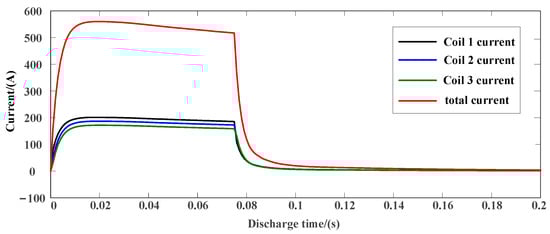 As shown in Figure 3 and Figure 4, the discharge current waveform of the capacitor and the discharge current waveform of the battery are, respectively, under the condition of the same discharge energy of the capacitor and the battery. It can be seen from the discharge current waveform that the capacitor discharge current pulse is high, but the current changes greatly, and the discharge current is unstable. Although the electromagnetic force generated at the maximum current is greater, its duration is short, the acceleration process is unstable, and the final hammer speed is only 6.9 m/s. The discharge current waveform of the battery is similar to the square wave, the current is more stable, the effective discharge current duration is long, the stable acceleration time is long, and the final hammer speed can reach 12 m/s. The multidirectional electromagnetic shock source adopts the battery direct power supply mode, which is not only simpler in the circuit, but also shortens the working cycle, and can make the hammer obtain higher kinetic energy under the same energy storage condition.