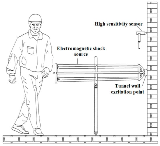 The detection method of a multiple-direction portable electromagnetic shock source is shown in Figure 6. In reality, the electromagnetic shock source is applicable to any scene since it can be excited in any direction. For example, in tunnel seismic detection, it can be laterally excited, when used for detection of urban roads or urban underground space, the electromagnetic shock source is vertically excited.