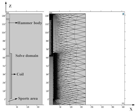 In this paper, COMSOL finite element simulation software is used to carry out the 2D simulation calculation of the electromagnetic launch process. Since the multi-azimuth electromagnetic shock source is an axially symmetric device, when analyzing the influence of parameters such as the power-on time and the initial position of the hammer on the launch energy, it can be solved by 2D finite element simulation. As shown in Figure 7, a 2D simulation model of the z-axis symmetry is established according to the specific size parameters in Table 1.