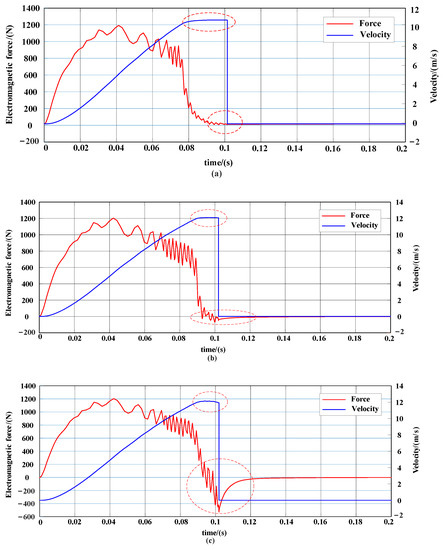 Variation curve of electromagnetic force and speed under different power-on times. (a) Electromagnetic force and speed change curve with power-on time of 80 ms. (b) Electromagnetic force and speed change curve with power-on time of 90 ms. (c) Electromagnetic force and speed change curve with power-on time of 100 ms. The red dotted circle respectively represent the trend of speed change and the presence or absence of reverse electromagnetic force. When the power on time is too long, the speed in the red dashed lines tends to decrease, and the reverse electromagnetic force is relatively large.
