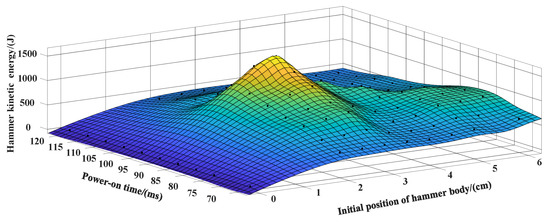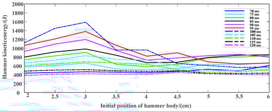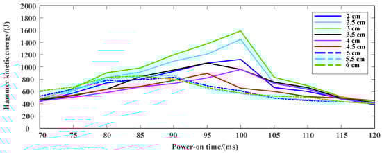 According to the results in Figure 10 and Figure 11, it can be seen that the kinetic energy range of the hammer body is 400–1600 J, and different power-on time as well as initial position have great influence on the final kinetic energy of the hammer body. In Figure 12, when the power-on time is 100 ms, the hammer has the maximum kinetic energy with the initial position of about 3 cm.