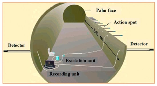 Tunnel seismic early warning can provide information about adverse geological formations ahead of the heading face within a distance of 100–120 m. Combined with geological data, it can accurately determine the location of abnormal formations such as karst caves, fault zones, and weak interlayers ahead of the heading face. According to the classification of observation systems, tunnel seismic prediction methods mainly include tunnel seismic prediction (TSP) [1,2,3], comprehensive seismic imaging systems [4,5,6], horizontal seismic profile [7,8], acoustic soft soil foundation detection [9], tunnel seismic tomography [10,11,12,13], tunnel seismic while drilling method [14], and three-dimensional true reflection tomography (TRT) [15,16,17,18]. The seismic sources used in these methods are mainly divided into explosive and non-explosive types. Explosive seismic sources generally use small explosives (30 g to 100 g), which have strong energy and can produce seismic waves with good pulse properties [19]. The collected signals have a wide frequency band and high signal-to-noise ratio, and the prediction distance can reach 100 m to 120 m. However, the use of explosive seismic sources requires pre-drilling, which not only increases the additional workload but may also damage the tunnel wall. At present, most engineering fields use TSP observation systems, which can only stimulate 24 shots on one side of the tunnel wall, and the limitation of the number of shots will affect the accuracy of data processing.