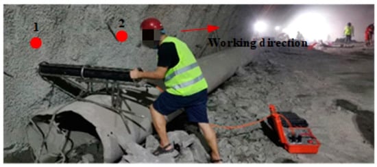 In the process of tunnel seismic advance prediction, 24 shots were hammered on one side of the tunnel wall. The distance between the first shot and the palm face was 15 m, the distance between shots was 1m, and the distance between the last shot and the geophone was 10 m. The data acquisition sampling interval is 41.7 μs, and the sampling length is 167 ms. Figure 14 is the schematic diagram of tunnel seismic advance prediction, and the working site is shown in Figure 15.