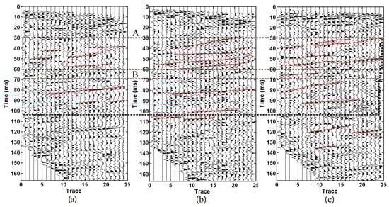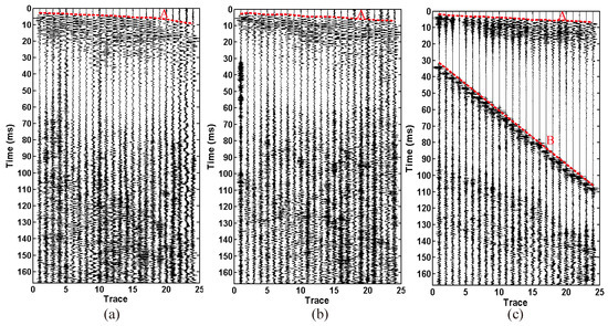 As shown in Figure 16, the original seismic records of three source X components are shown. A is a direct wave and B is a sound wave. The acoustic energy in the seismic records of the sledgehammer source and the electromagnetic source is weak, while the acoustic energy in the seismic records of the explosive source is strong. During the data acquisition of the sledgehammer source and the electromagnetic source, the random noise in the seismic records is relatively strong due to the influence of large mechanical operations in the tunnel (Figure 16a,b).