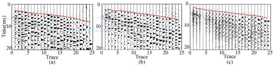 Data processing results. (a) 24 pound sledgehammer. (b) Electromagnetic shock source. (c) explosive source. The red line is identified as the reflection wave from the leading direction.