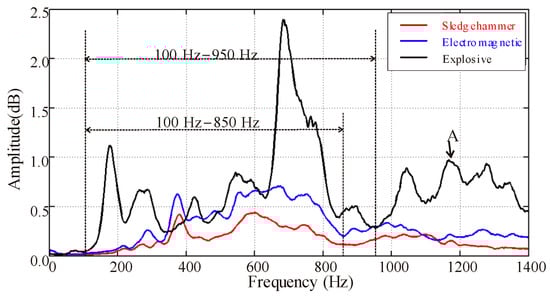 As shown in Figure 18, the spectrum analysis results show that the main frequency range of explosive source data is 100 Hz to 950 Hz, and the signal with frequency greater than 1000 Hz is mainly acoustic interference. The main frequency range of data from the sledgehammer source and the electromagnetic source is 100 Hz to 850 Hz. The peak energy of the spectrum curve shows that the explosive source has the highest energy and the sledgehammer source has the lowest energy.
