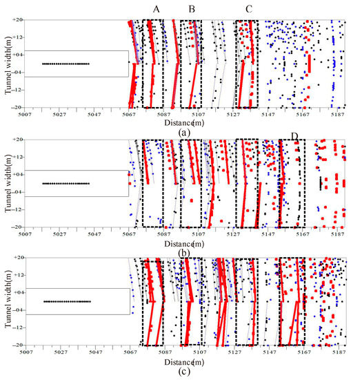 Forecast Interpretation Chart. (a) 24 pound sledgehammer. (b) Electromagnetic shock source. (c) explosive source. The red line and red dot represent the position of the strong impedance interface extracted from P-wave migration data, the blue line and blue dot represent the position of the strong impedance interface extracted from SV wave migration data, and the black line and black dot represent the position of the strong impedance interface extracted from SH wave migration data. The red line, blue line, and black line are interfaces with relative energy greater than 20%, while the red dot, blue dot, and black dot are interfaces with relative energy between 20% and 50%.