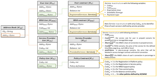 - The User List contract (), MNO List contract (), and Service Provider List contract () store the list of registered users, network providers, and service providers, mapped with the following structures, respectively: