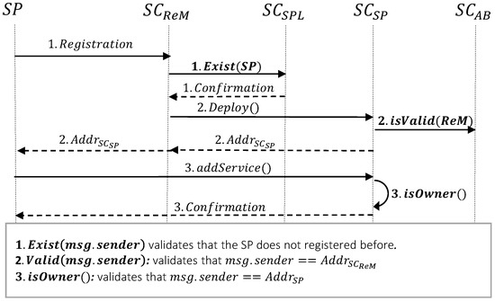 - First, sends the registration request to . Since each service provider can register only one time, needs to verify that the is not registered beforehand. To do so, it calls the isExist() function of and sends the address of the caller as its argument. Note that here the caller is , so sends the in isExist() function. Since msg.sender in Solidity language is the address of the caller or the creator of the transaction, in the rest of the paper we use msg.sender to indicate the caller of the function.