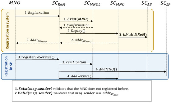 - sends the registration request to . Similar to the service provider registration procedure, each MNO can register only one time to the system. So, verifies that the is not registered beforehand (i.e., by using the isExist() function of and sending the MNO address, msg.sender, as its argument).