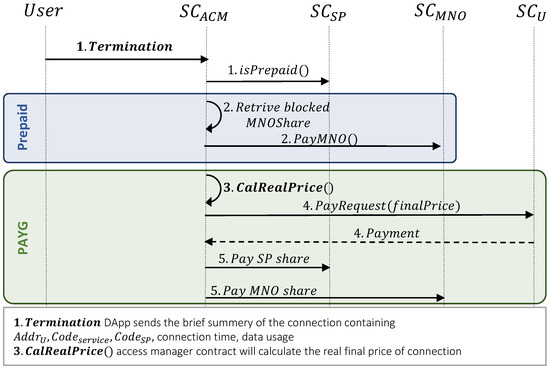 - After termination of the service usage, the access manager smart contract pays the MNO, SP, and (if it is required) the user, according to the pricing model.