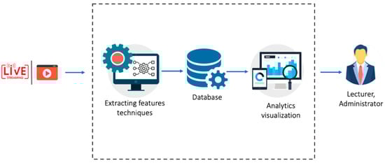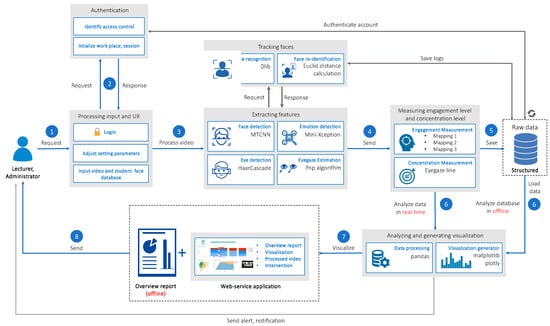 The technical architecture of the developed platform is shown in Figure 2. First, the system processes the video from the streaming URL or from the recorded video. Then, the system uses computer vision and deep learning techniques to extract emotional information from the entire video. The extracted information, such as face position information, student identification, emotional state, eye gaze, concentration level, and engagement level, is stored in the database. After processing the video, the system proceeds to load data from the database and analyze it to generate analytical data and statistical charts and display them on the web application for lecturers.