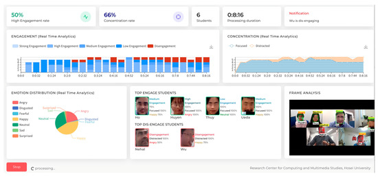 In online learning, the problem of student disengagement and poor concentration is gaining attention. In the classroom, students’ engagements consist of their behavioral, cognitive, and emotional elements [3]. For example, student academic effort, persistence, attention, concentration, and a lack of conduct problems are associated with behavioral engagement; thoughtfulness and willingness to make the efforts necessary to understand complex ideas and master difficult skills are related to cognitive engagement; and the presence of interest, enthusiasm, the absence of anger, anxiety, and boredom are connected with emotional engagement [3]. It is also evident that students’ engagement is directly proportional to their achievement [4]. Due to poor concentration and a low level of engagement during the lecture, many students fail to achieve the learning goal. This also raises the concern of not receiving a high-quality education. This is because it is challenging for an instructor to keep a close eye on the entire class and regulate teaching. Therefore, for an educational system, it is essential to monitor students’ engagement and concentration frequently, as learning occurs when the students are meaningfully involved in the learning environment.