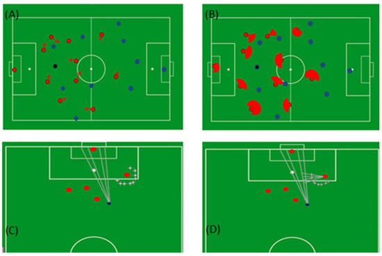 Our results illustrated that for both halves of the match, most of the shooting opportunities of the visitors’ team were created in Zone 1 (please see Figure 5A,B). Moreover on the second half of the match the visitor team can only created shooting opportunities on the right side of zone 1 (Figure 5B). No shooting opportunities were created for the remaining zones.