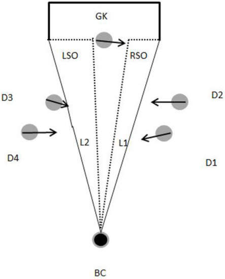 As represented in Figure 1C,D, each shooting opportunity may occur on both sides of the goalkeeper or (dependent on the goalkeeper’s position) on one side only. Hence, to represent each shooting opportunity for the ball carrier, two polygons were created. One outlines the ball carrier, the goalkeeper’s current or estimated position, and the left post of the goal. Another polygon outlines the ball carrier, the goalkeeper’s current or estimated position, and the right post of the goal. The goalkeeper estimated position was calculated on the basis of the direction of the goalkeeper velocity vector (please see Figure 2). Each polygon allows the depiction of the space available for a shot to happen and was updated every 0.2 s, continuously assessing whether the defenders had the possibility to intercept or block a shooting opportunity.