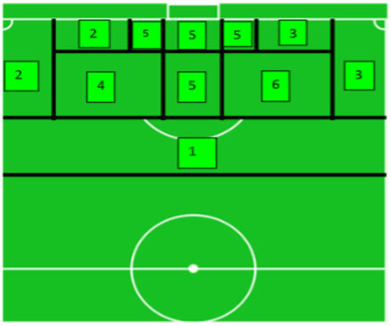 According to the area of the field, shooting opportunities may vary the level of threat for the defending team. Thus, we decided to divide the last 30 m of the pitch into 6 zones with different sizes and shapes (please see Figure 3). This division was made as a function of the penalty area (usually called ‘the box’), which is a rectangular area that extends 16.5 m to each side of the goal (33 m in total) and 16.5 m in front of it. The literature shows evidence that there is a statistical difference in goals scored between shots inside ‘the box’ and outside of ‘the box’ [23]. Additionally, [24,25] identified (i) zones where teams attempted more shots; (ii) zones with more shots towards the goal; and (iii) zones where a greater number of goals were scored. These zones are a simple extension of ‘the box’ line boundaries and an additional line, which marked the 30 m of distance to the goal [26]. This zone representation provides an accurate identification of the origin of the shooting opportunities and enriches the spatial information obtained from the heatmaps.