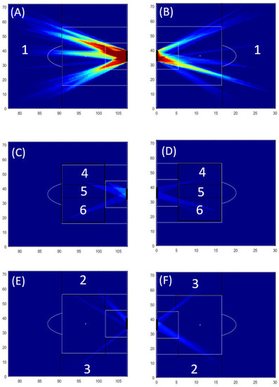 Our results illustrated that for both halves of the match, most of the shooting opportunities of the home team were created in Zone 1 (please see Figure 4A,B). Fewer shooting opportunities were created in Zones 4 and 6 and no shooting opportunities were created in Zone 5 (Figure 4C,D). In addition, fewer shooting opportunities were created from the lateral zones (Zones 2 and 3) of the field (please see Figure 4E,F).