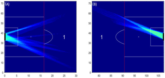 Heatmaps of shooting opportunities of the visitors’ team. The heatmaps (A,B) illustrate shooting opportunities created outside ‘the box’ (Zone 1) for the first and second half, respectively. No other shooting opportunities were depicted by the algorithm in the remaining zones (i.e., the areas inside ‘the box’ and the lateral ones—on the second half). A colour scale was used to provide information of the frequency of the shooting opportunities. Dark blue means that no shooting opportunity was available, whereas dark red means that shooting opportunities were available for more than 100 s per match.