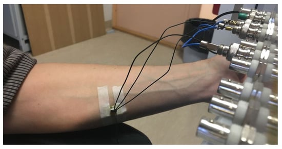 - The electrode was placed on about the area of the centerline of the middle side of the forearm and fixed by using a gentle medical tape (Figure 1);