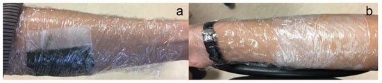 - The compress of mud (Cycle C) (Figure 2a) or water (Cycle D) (Figure 2b) was placed on the inner side of the forearm and covered with PVC film.