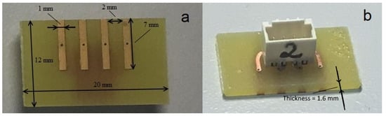 The gap between the electrodes was 2 mm and the width of the electrode contact surface 1 mm (for the dimensions, refer to Figure 3a). The choice is explained by the wish to concentrate on a small skin area with the presumption of its relative uniformity. The electrode contact surfaces were galvanically gold-plated. The choice of gold plating originated from the expectation that the capacitive properties of the SC dominate in the dry condition of the skin []. As a result, the polarization properties of gold are hidden by the capacitive properties of the SC, which are of a much larger scale. However, with the increase of moisture in the SC and sweating, its capacitive properties disappear quickly and are replaced by resistive ones. However, gold is durable and has constant properties when compared to medical-grade gel electrodes, which are inconvenient in application.