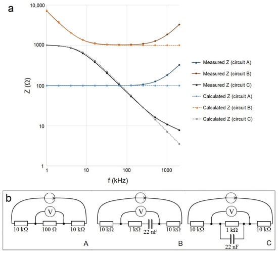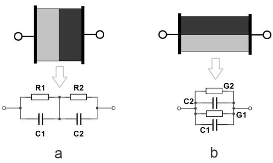 Typically, Z is used to describe the object when it is represented as layers of different conductivity (parallel connections of single resistors R and single capacitors C) in series (Figure 4a), and Y is used when the layers are in parallel (Figure 4b) [].