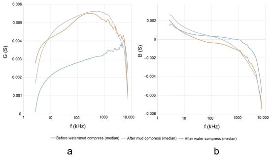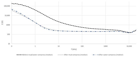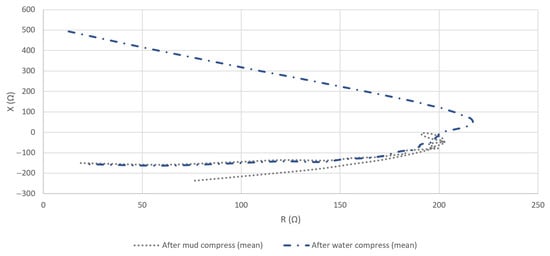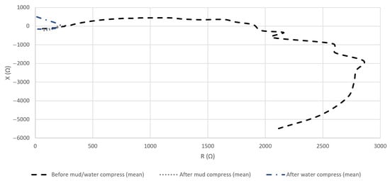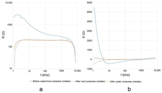 The following assumptions can be made based on the mineral concentrations and skin electrical properties. During mud pack therapy, the salts dissolved into the skin, and throughout, the increased moisture caused the measured R to differ significantly from the measured R after tap water application in the selected frequency interval (10 kHz …1 MHz). However, the differences in X at the same second frequency interval refer to changes in the polarization of cellular membranes, proteins, and other organic macromolecules—possibly related to the specific effect of pelotherapy. However, the exact mechanism is complex and still debatable, as the differences in the imaginary parts of the immittance were revealed concurrently, while the separation of the specific and non-specific effects of pelotherapy needs further research.