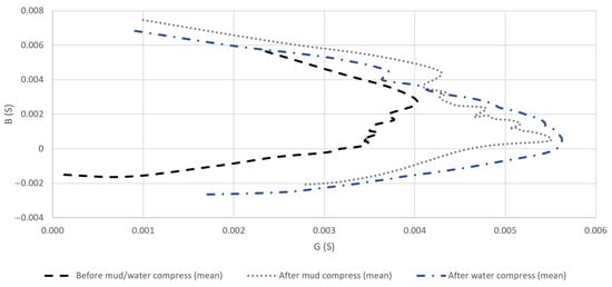 Under linear conditions in the case of the same tissue, the unity cell inverse of Z (admittance Y) contains the same information as the unity cell Z—however, shown differently (for a full theoretical description, see []). Y can be calculated (where G is conductance and B is susceptance) as