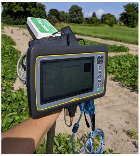 An initial benchmark experiment took place during the summer of 2019, when the handheld setup was used. The plants were sown on 21 June 2019, at the Emile A. Lods Agronomy Research Center of Macdonald Campus, McGill University, divided into 22 plots, arranged in a grid of 2 × 11. The 11 different bean varieties/cultivars (Phaseolus vulgaris L.) were Apex, Argosy, Calmant, Compass, Dresden, Knight rider, Majesty, Mast, Nautica, Red rider, and Sheek. All varieties had two replicates. In each plot, there were four crop rows. Measurements were taken on each plot on the dates listed in Table 1, including their geo-references and timestamps. For each plot and date, eight locations were selected to increase the variety of sampling sites for data collection. All plots were exposed to the same management practices and were of the same size (6.75 m2). The plants were harvested on 7 October 2019.