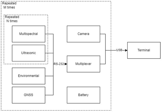 In addition to the previously mentioned sensors, other components in this subsystem included a laptop computer as the control terminal, two 8-Port USB to Serial Hubs (StarTech.com Ltd., London, ON, Canada), and two power banks of 20,000 mAh working as batteries. The power banks, serial hubs, and their connectors were located inside plastic enclosures for additional protection. The computer ran the Graphical User Interface (GUI) for the operator to monitor and adjust the behavior of the system. The serial hubs are required to facilitate the connections of the previously mentioned sensors to the terminal. Figure 2 illustrates the connections between the different electronic components of the HTPP. In particular, M was 2 and N was 3 in the built platform, but the versatility of the design allows the number of sensor blocks to be reduced or increased as required by the size, budget, and nature of the experiment.