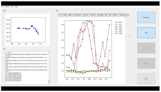 A Python script relying on open-source libraries was made to log the measurements from all sensors into text files and display the GUI. Within it, there is information for the operator about the connected sensors, a map tracking the trajectory of the vehicle, video streaming of the cameras, and real-time plots of the sensor readings. A bar of tabs was used to change between the plots of the several measured variables. Certain settings could be modified, such as the spacing between the sensors, which offered the ability to disengage any subset of sensors. Figure 4 shows a screenshot of the main window.
