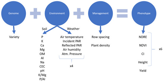 - Built linear models; where the phenotypical data for each of the measurement dates plus the yield were the dependent variables; and the management practices, soil, and measured weather factors, as shown in Figure 5, were independent variables.