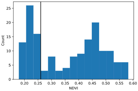 Just as for the benchmark experiment with the handheld setup, for the experiment with the vehicle-mounted HTPP platform the raw data were saved as text files, which were parsed to comma-separated values file format using a Python script. In the same script, the longitude and latitude values reported by the GNSS receiver were projected into planar coordinates. The phenotypical variables (NDVI, NDRE, CI, plant height) and the environmental factors (air temperature, air moisture, incident PAR) were then grouped by plot based on geographical location. The maximum and the average of values above a threshold were calculated per plot. The threshold was defined using the histograms of the readings, which showed a bimodal distribution, and the principle of Otsu’s method [37] was used to find the optimal threshold that maximizes inter-class variance. The histograms with a bimodal distribution were assumed to be the result of the sum of two normal distributions: one for measurements of soil and another for measurements of plant tissue, as exemplified by Figure 6. This process was repeated separately for each of the dates where data were collected. These values were used to populate maps for each variable and date. The results per plot and date were then imported into MATLAB (The MathWorks, Inc., Natick, MA, USA) for additional processing.
