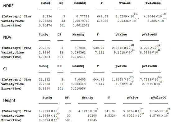 The results of the ANOVA with repeated measurements over time are shown in Figure 7. This test shows that both time, and the interaction between the variety and time, are significant for all evaluated VIs as well as plant height, given that all the p-values are below 0.05, even when the Greenhouse-Geisser adjustment is applied (pValueGG in the Figure 7). This means that the effect of the variety as a discrete factor varies with time, when considering its explanatory power in the measured plant traits.