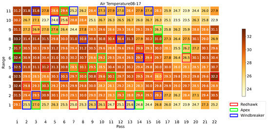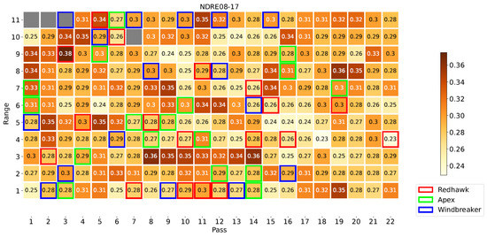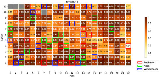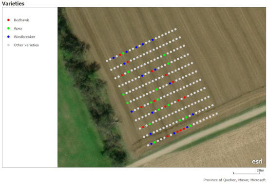 Figure 8 illustrates the locations of each plot in the field, highlighting those of the Apex, Windbreaker, and Redhawk varieties, which will be used as examples throughout this section. Specifically, these three varieties were selected to represent the varieties with high, medium, and low yield, respectively. Figure 9, Figure 10 and Figure 11 present some of the properties mapped by the system. As these are the output of the system, they indicate the ability of the platform to complete its task. For a few plots, no phenotypical data were available. There were two possible reasons for this: (1) the plants sown there were removed at an earlier date or (2) they were inaccessible to the HTPP platform because of the presence of a fence in the field. In these maps, the measurements from the DAS43X sensor were aggregated by averaging over the plots. For the multispectral and ultrasonic sensor, it was important to reduce the effect of soil patches which were measured inside the field of view of the sensor, given the spacing between the crop rows. Because of this, the phenotypical data were aggregated per plot by two methods: (1) finding the maximum and (2) calculating the mean of the values above a certain threshold, as explained in Section 2.5.