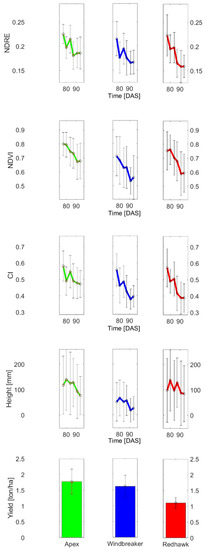 Finally, Figure 12 displays the average behavior of the variables across time for the example varieties, along with the standard deviation. In general, the values of the measured variables decreased as time passed, as was expected given the overall trend in the first experiment and the phenological stage of the crop around the dates covered by the experiment.