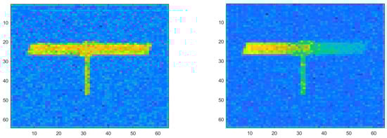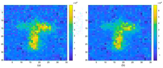 Figure 8 depicts the experimental results of target correlation imaging with distance information at different times. According to the above formula of the root mean square error and peak signal-to-noise ratio, we calculated that the RMSE of Figure 8a is , the RMSE of Figure 8b is . The calculated root mean square error of the experiment shows that the range image of the target can correctly reflect the range information of the target.