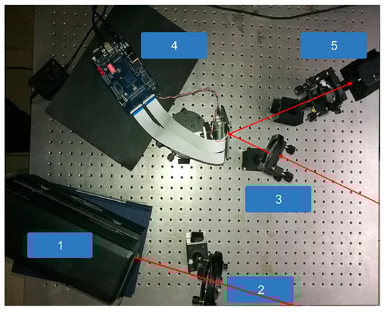 Schematic diagram of experimental launch system: (1) laser (532 nm), (2) beam expander, (3) convergent lens, (4) DMD, (5) PIN single point detector. The red arrow in the figure represents the direction of the light path.