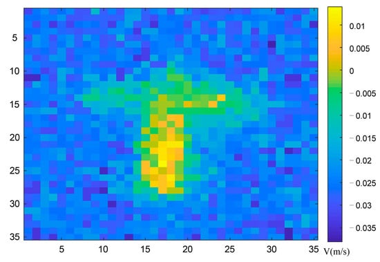 Based on the range image obtained above, we performed slicing difference on the range image to obtain the experimental results of associated velocity imaging based on the slicing difference. The velocity image results are shown in Figure 9 below, where the horizontal and vertical coordinates, respectively, represent the pixel resolution of the target, and different depth colors represent the different velocities of each part of the target.