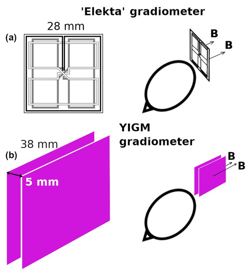 (a) Elekta’s gradiometer scheme and (b) representation of the YIGM gradiometer scheme for measuring tangential derivatives of the radial component of the magnetic induction vector ().