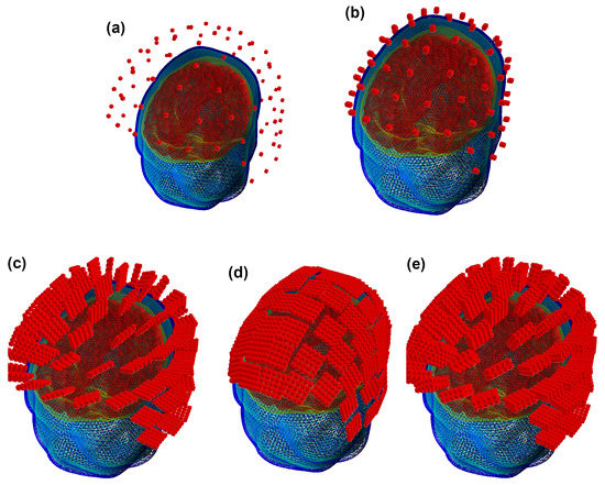 In this manner, we obtained three SQUID and OPM layouts used for further computations together with a set of YIGM layouts. The original SQUID system provides us with two SQUID layouts, namely, containing 102 magnetometers (see Figure 4a) and 204 planar gradiometers (not shown). For OPMs, we obtained the SQUID-like layout consisting of 102 points, which are locations for centers of OPM gas cells (Figure 4b). For YIGM, we formed three layouts, one consisting of 102 normally oriented YIGMs (Figure 4c), one for tangential component measurements (102 tangentially oriented YIGMs), see Figure 4d), and the last one for gradiometer measurements of the radial component (see Figure 4e).