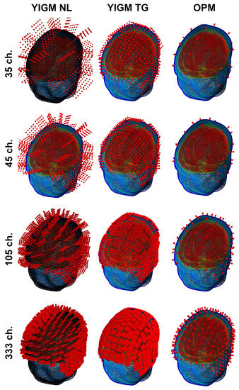 Our future work on forward modeling will be devoted to calculating optimal sensor locations on the head, using more complex principles than just uniform distribution, and incorporating more realistic source variances. We will also explore the possible use of an averaged head model instead of an individual one. A common practice for EEG and MEG forward problem modeling is the boundary-element method (BEM) (MNE, Brainstorm). Therefore, we plan to try different methods, including more advanced schemes, such as the finite-element method (FEM) [53]. Finally, we will pay special attention to tangential YIGM layouts and their effectiveness.