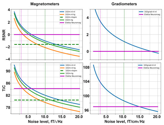 The dependencies of metrics on the noise levels for different uniform layouts are shown in Figure 7. The structure of this figure is similar to that of Figure 6. With an increase in the number of sensors in a layout, the metric values grow for both types of magnetometers and gradiometers.