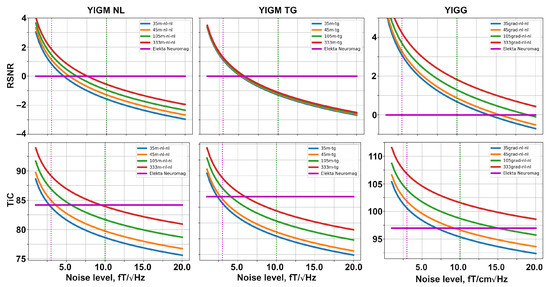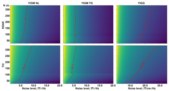 Figure 8 shows a visual representation of the required number of channels in two types of magnetometric layouts, as well as gradiometer layouts, for a certain intrinsic noise level of YIGM sensors. The red line indicates the same value as for Elekta Neuromag in terms of relative SNR (top row) and information capacity (bottom row). In the case of RSNR, we have zero on the red line since we take the logarithm of 1. The dependencies for relative SNR represent almost straight, perpendicular vertical lines, indicating no explicit dependency between intrinsic noise and the number of channels in the layout.