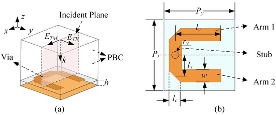 Figure 1a depicts the fundamental U-shaped resonator structure used in this article. The full-wave analysis of this structure is performed using the High-Frequency Structure Simulator (HFSS). Using the periodic boundary condition (PBC) in HFSS, the electric field of the TM polarization incident Floquet mode is along the positive x-axis, whereas the electric field of the TE polarization is along the positive y-axis. Due to its wide frequency response, the U-shaped resonant ring composed of a microstrip line structure has been widely used in antenna and feeding structure design over the past few decades [35,36,37,38]. Nonetheless, its application in FSS and PSS has received limited consideration [31,39,40]. Figure 1b demonstrates that the metallic portion of the U-shaped ring consists of two open-ended arms and a stub with a long edge along the y-axis. The specific geometric dimensions of the adopted U-shaped resonator are detailed in Table 1. Our designs employ Taconic RF-35 substrates with a dielectric constant of 3.50 and a loss tangent of 0.002.